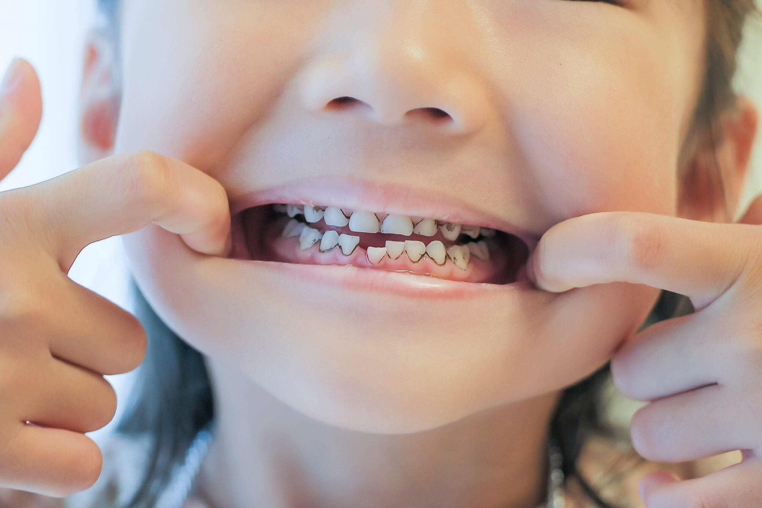 乳歯の初期の虫歯は白い場合もあります。「虫歯は黒い」というイメージをもっている保護者の方も多いので、発見が遅れ、進行することもあるでしょう。