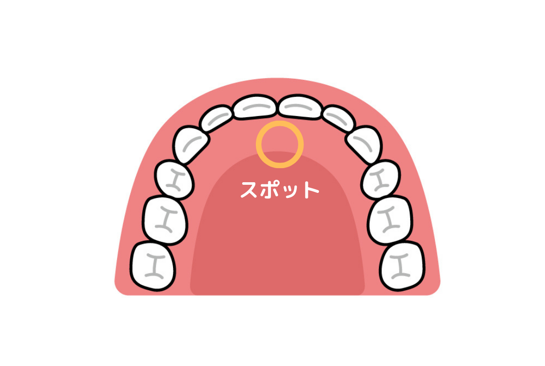 「スポット」と呼ばれる上の前歯の裏側に舌先をおき、舌の表側が上顎にくっついた状態が正しい位置です。