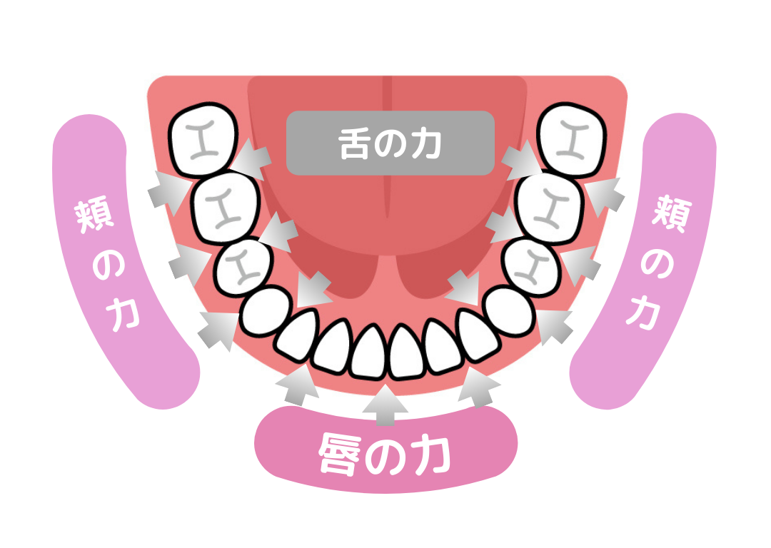 歯は唇や頬、舌などの筋肉に取り囲まれていて、外側からは口唇や頬が、内側からは舌が、それぞれ歯に圧力を与えています。