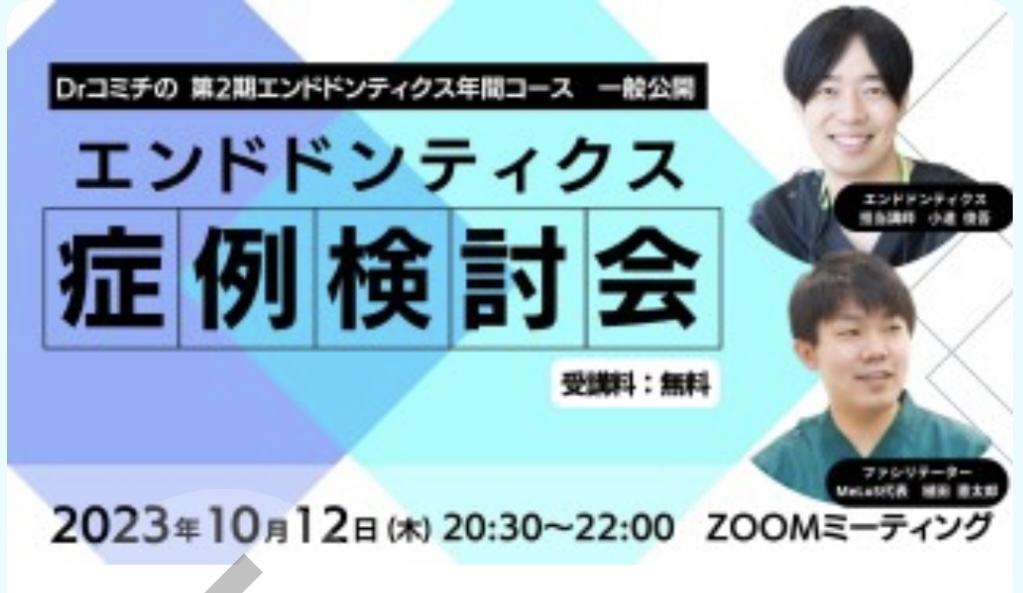 ドクターコミチのエンドドンティクス年間コースのフォローアップとしてウェビナーでの症例相談会に登壇しました。今回はこれまでの「既に頂いた資料から私の考えや治療方針を説明する形式」ではなく、実際に相談者にZoomで登壇してもらい直接対話をしながら症例相談を行いました。