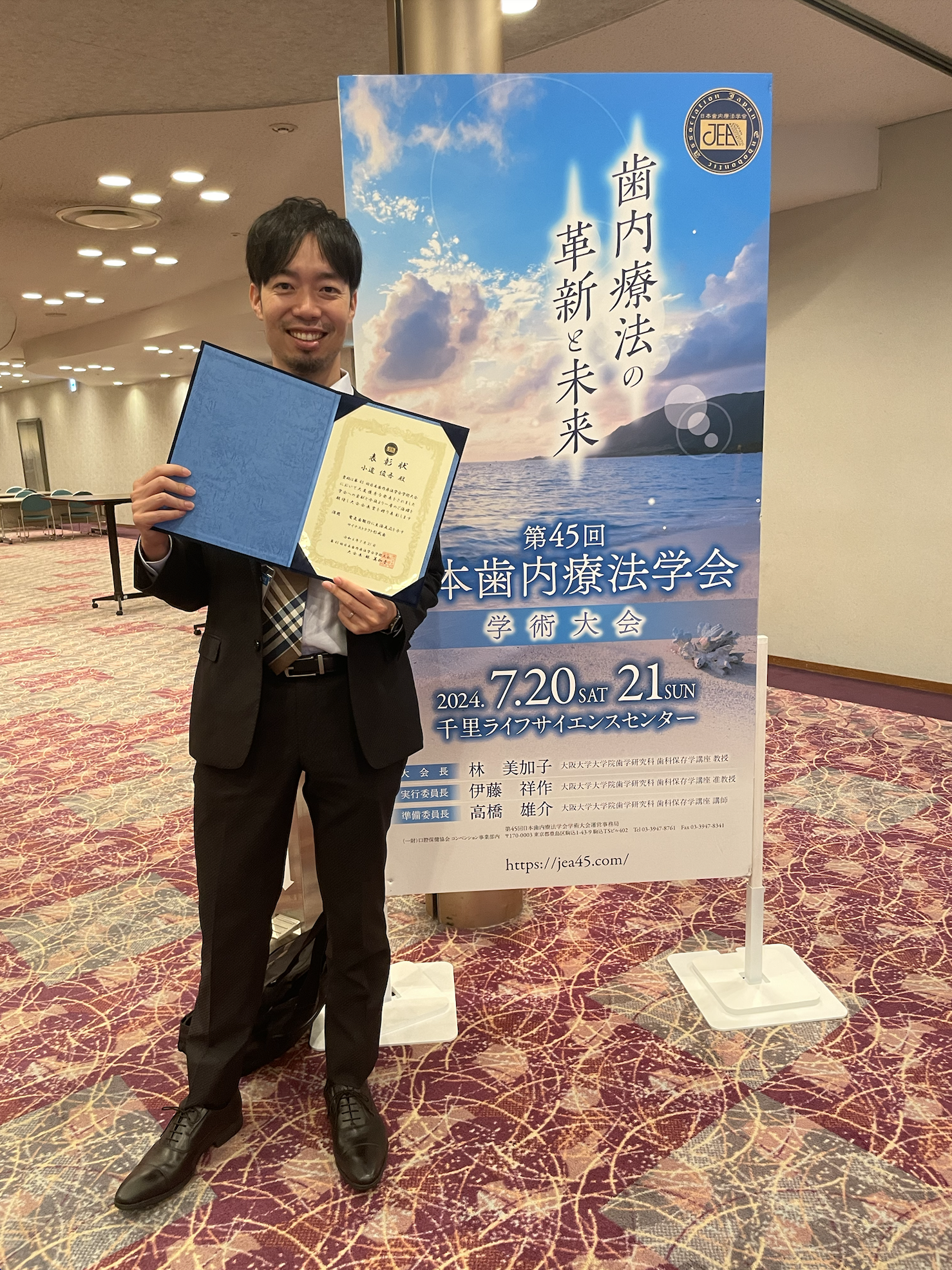 今回の学会では、担当が私の出身である大阪大学の歯科保存学講座ということもあり、大学時代の懐かしいメンバーに会うことができたり、他大学の先生と交流することもできたりして非常に充実した学会となりました。また、テーブルクリニックでの発表について「大会会長賞」を受賞して、大学に所属していた間に大変お世話になった林教授から表彰状を頂くことができました。今回の学会で学んだことを、日々の臨床の少しでも取り入れていければいいと考えております。