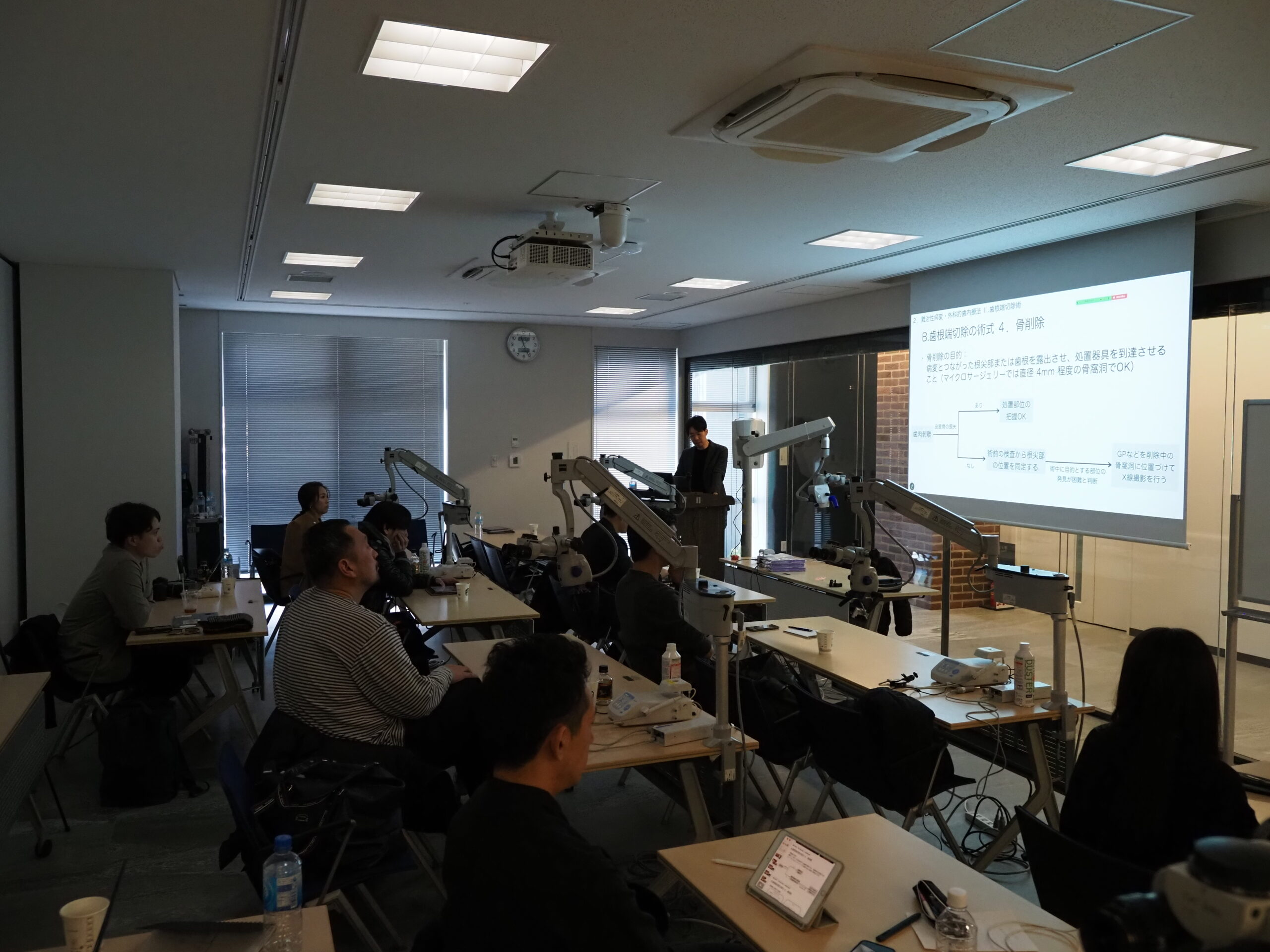 私が講師を務めさせていただいている年間コースのセミナーの第3期5日目を行いました。今回は、受講者全員にマイクロスコープを使ってもらうため、大阪大学中之島センターのセミナールームを借りて、そこにマイクロスコープを設置して講義・実習を行いました。